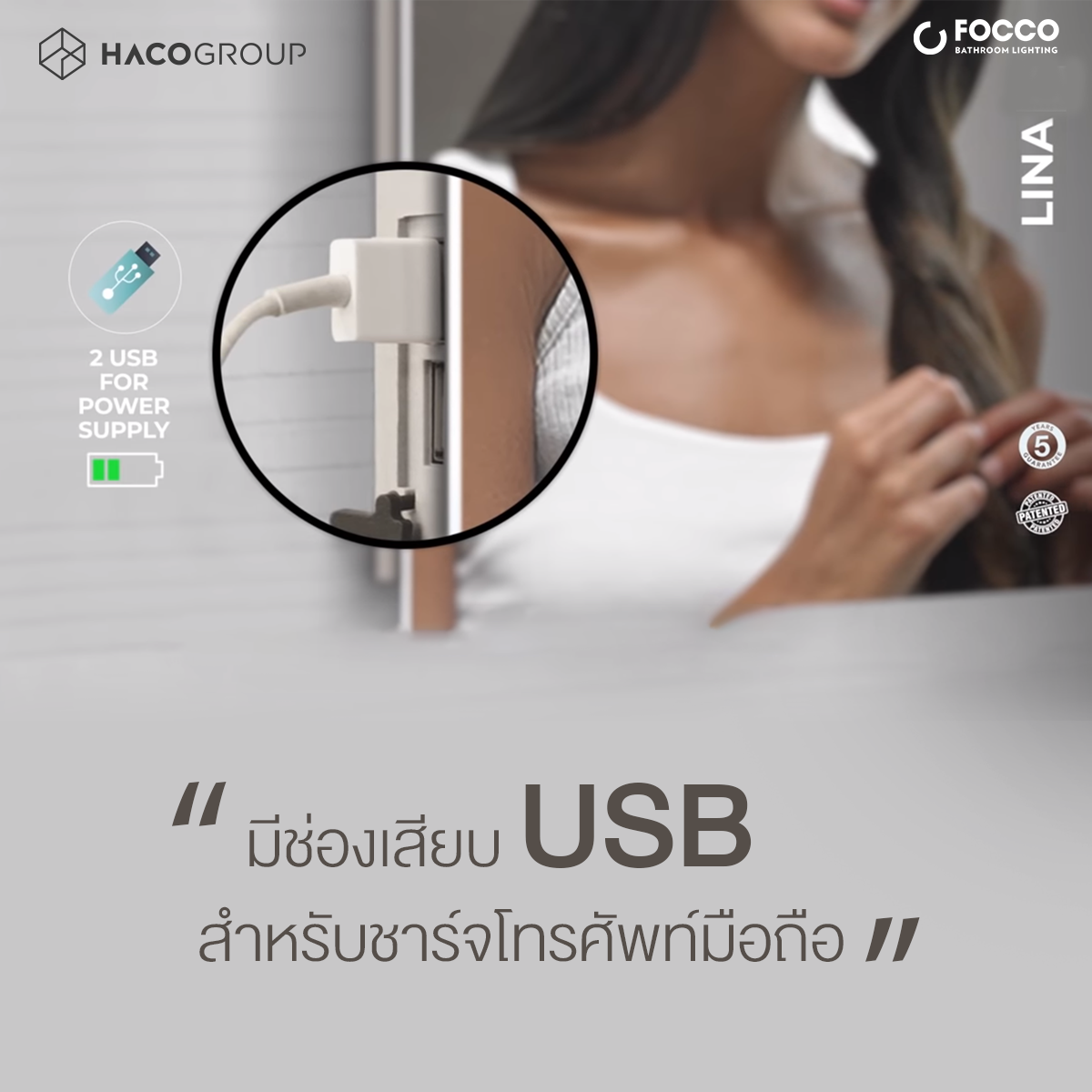 FOCCO กระจกไฟ LED รุ่น LINA M0002 มีช่องเสียบ USB ถึง 2 ช่อง สามารถใช้ชาร์จโทรศัพท์มือถือและอุปกรณ์อิเล็กทรอนิกส์ต่าง ๆ ได้