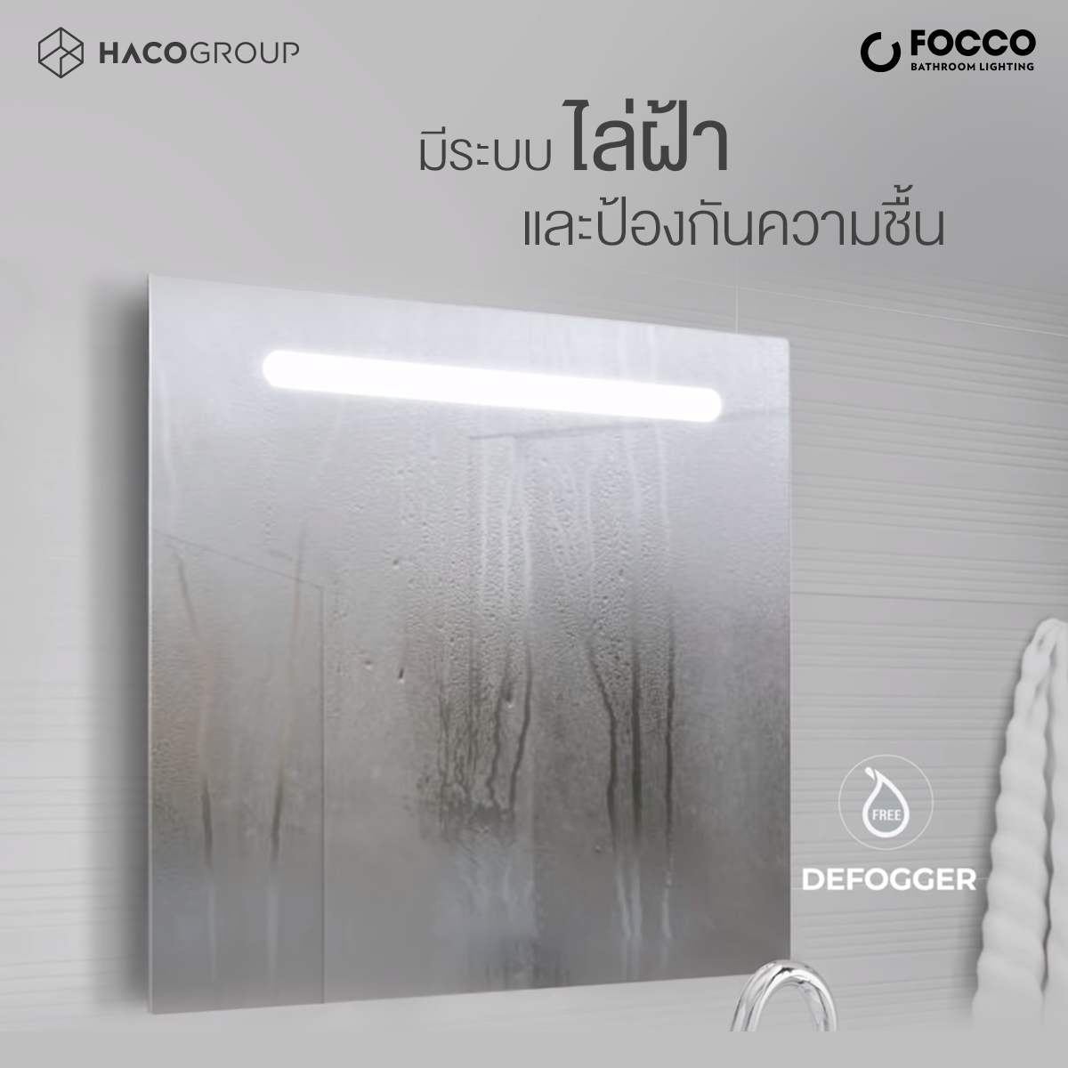 FOCCO กระจกไฟ LED รุ่น LINA M0002 มีระบบไล่ฝ้าและป้องกันความชื้น แก้ปัญหาฝ้าบนกระจก ทำให้มองได้ชัดเจน เมื่อเปิดทิ้งไว้นาน 30 นาที ระบบสามารถปิดได้เองโดยอัตโนมัติ